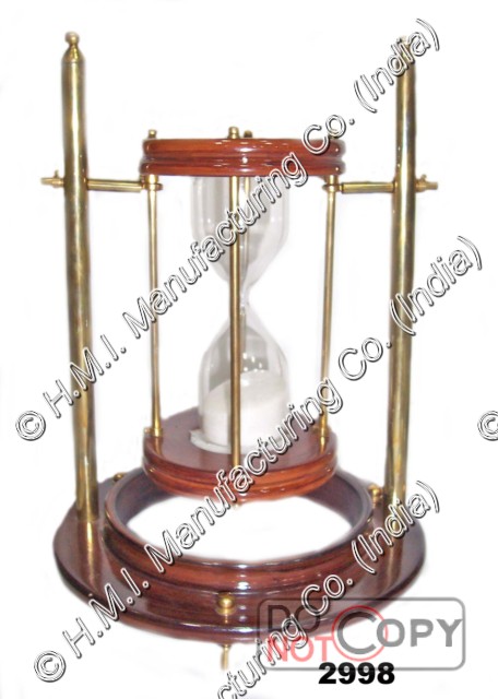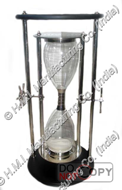 An hourglass, also known as a sandglass, sand timer, sand clock or egg timer, is a device for the measurement of time. It consists of two glass bulbs placed one above the other which are connected by a narrow tube. One of the bulbs is usually filled with fine sand which flows through the narrow tube into the bottom bulb at a given rate. Once all the sand has run to the bottom bulb, the device can be inverted in order to measure time again. The hourglass is named for the most frequently used sandglass, where the sands have a nominal running time of one hour.